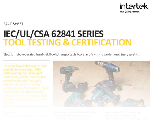 IEC 62841 addresses the safety of electric, motor-operated, or magnetically driven tools with provisions for hand-held tools, transportable tools, and lawn and garden machinery. Download our Fact Sheet for an Overview of IEC 62841.